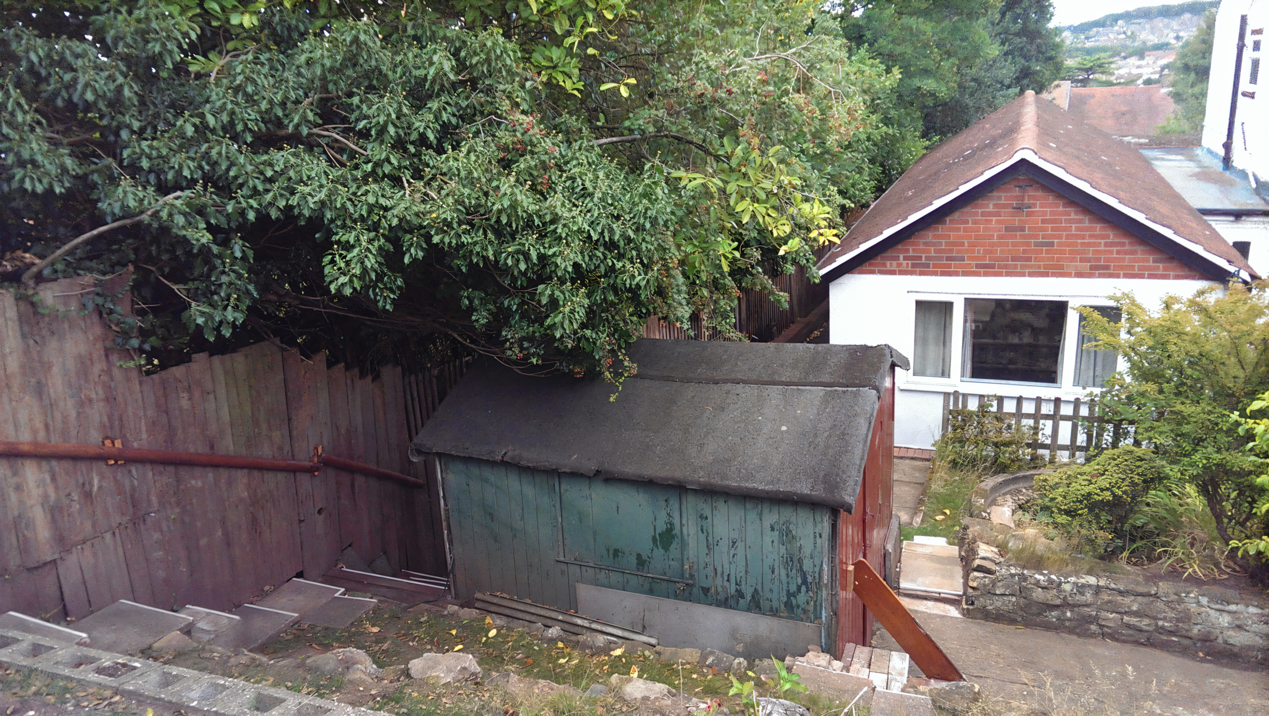 GARAGE: 16′ x 9′ (4.88 x 2.74) Concrete block construction garage with metal up and over door, concrete floor, area at right hand side.