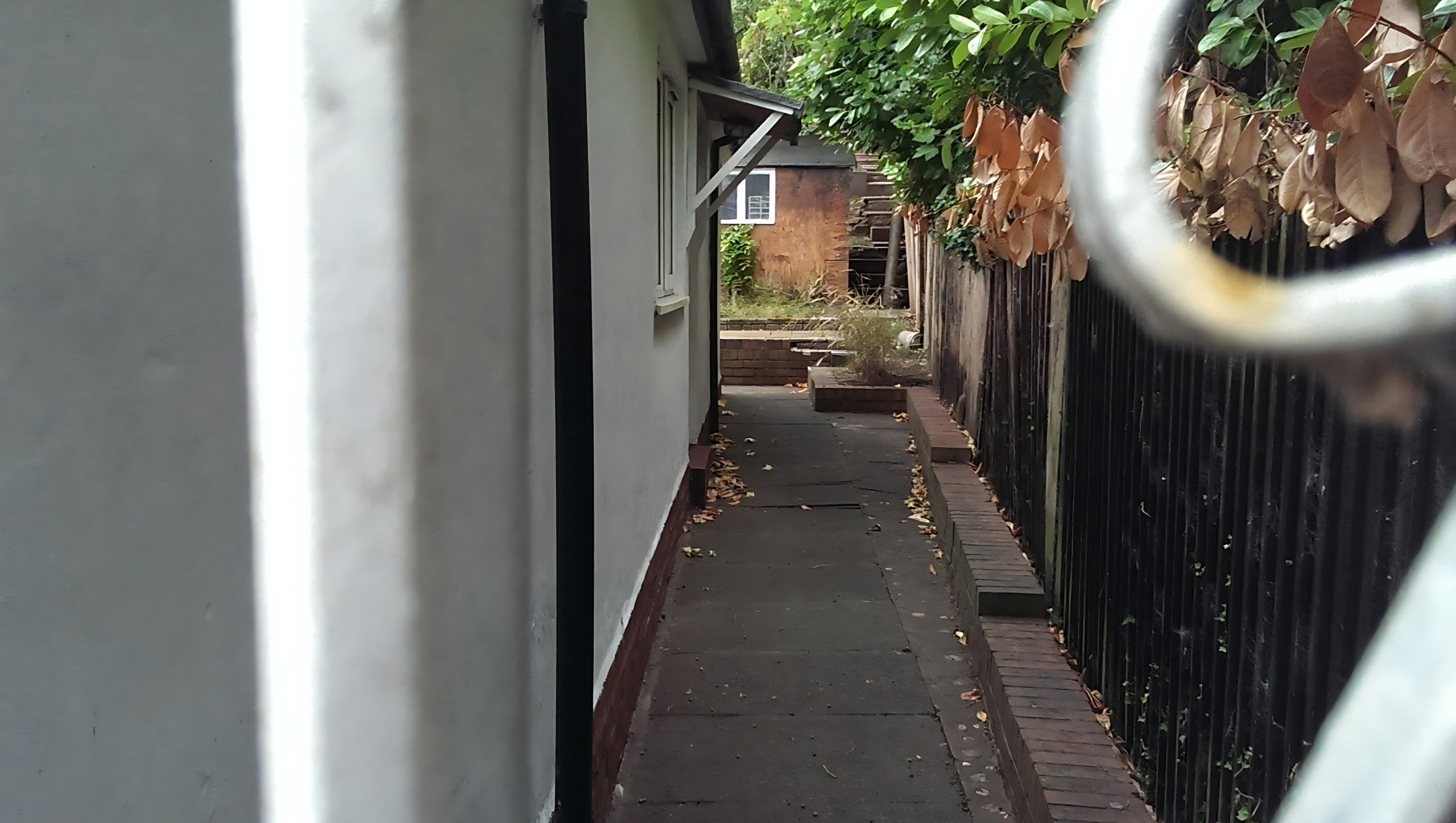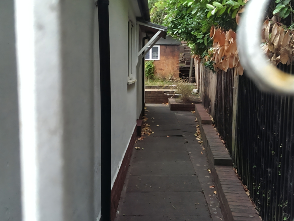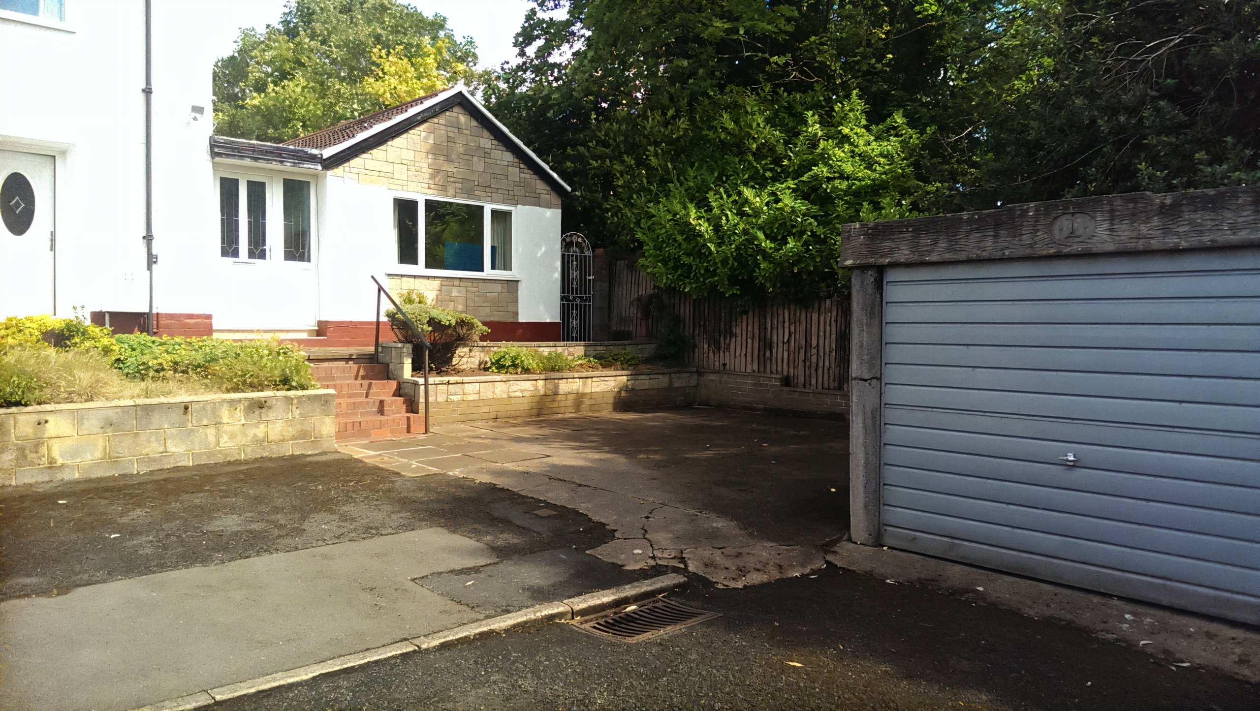 FRONT GARDEN: Area beside garage for off street parking. Raised flower bed beside steps to front path leading to metal gate with private side access.